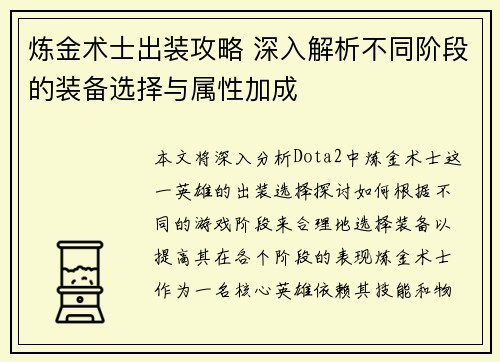 本文将深入分析《Dota 2》中炼金术士这一英雄的出装选择,探讨如何根据不同的游戏阶段来合理地选择装备,以提高其在各个阶段的表现。炼金术士作为一名核心英雄,依赖其技能和物品的组合来充分发挥自己的优势。本文将从以下四个方面进行详细阐述:第一,初期阶段的装备选择;第二,中期阶段的装备调整;第三,后期阶段的装备优化;第四,属性加成对炼金术士战斗力的影响。每个阶段的装备选择都有其独特的重点,理解不同阶段装备的作用能帮助玩家在游戏中做出最优的决策,确保炼金术士能够在游戏的不同阶段都发挥最大效果。